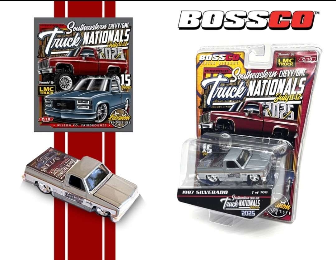 This BossCo, Southeastern Truck Nationals 2025, Commemorative, 1987 Chevy Silverado was customized and re-packaged by the Boss Company with Artwork from the SETN Truck Show held on July 11-12, 2025. Finished in Silver with Custom Show Graphics. Limited to 100 pcs. produced.